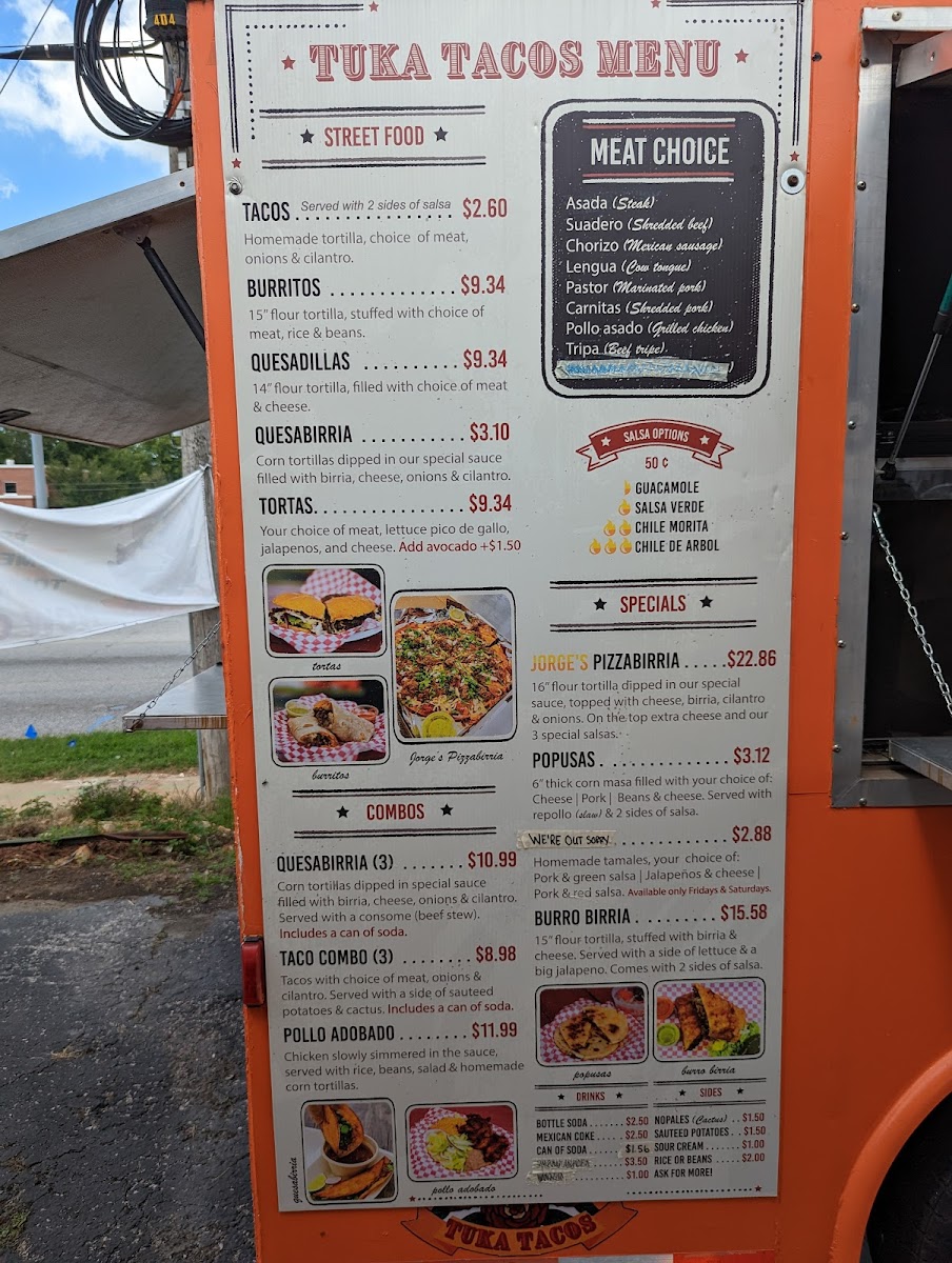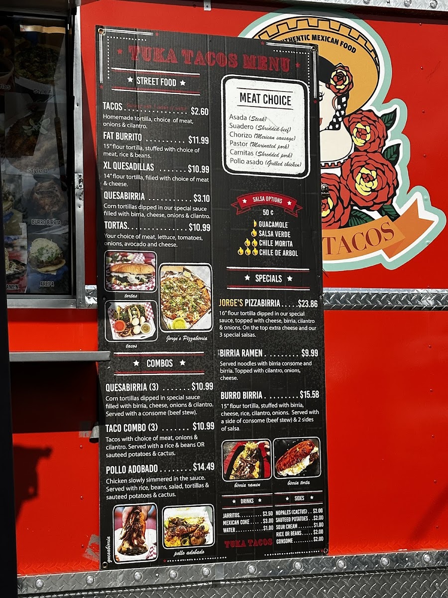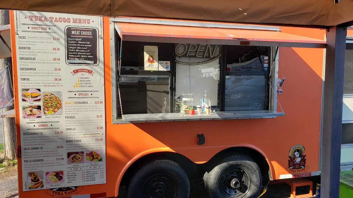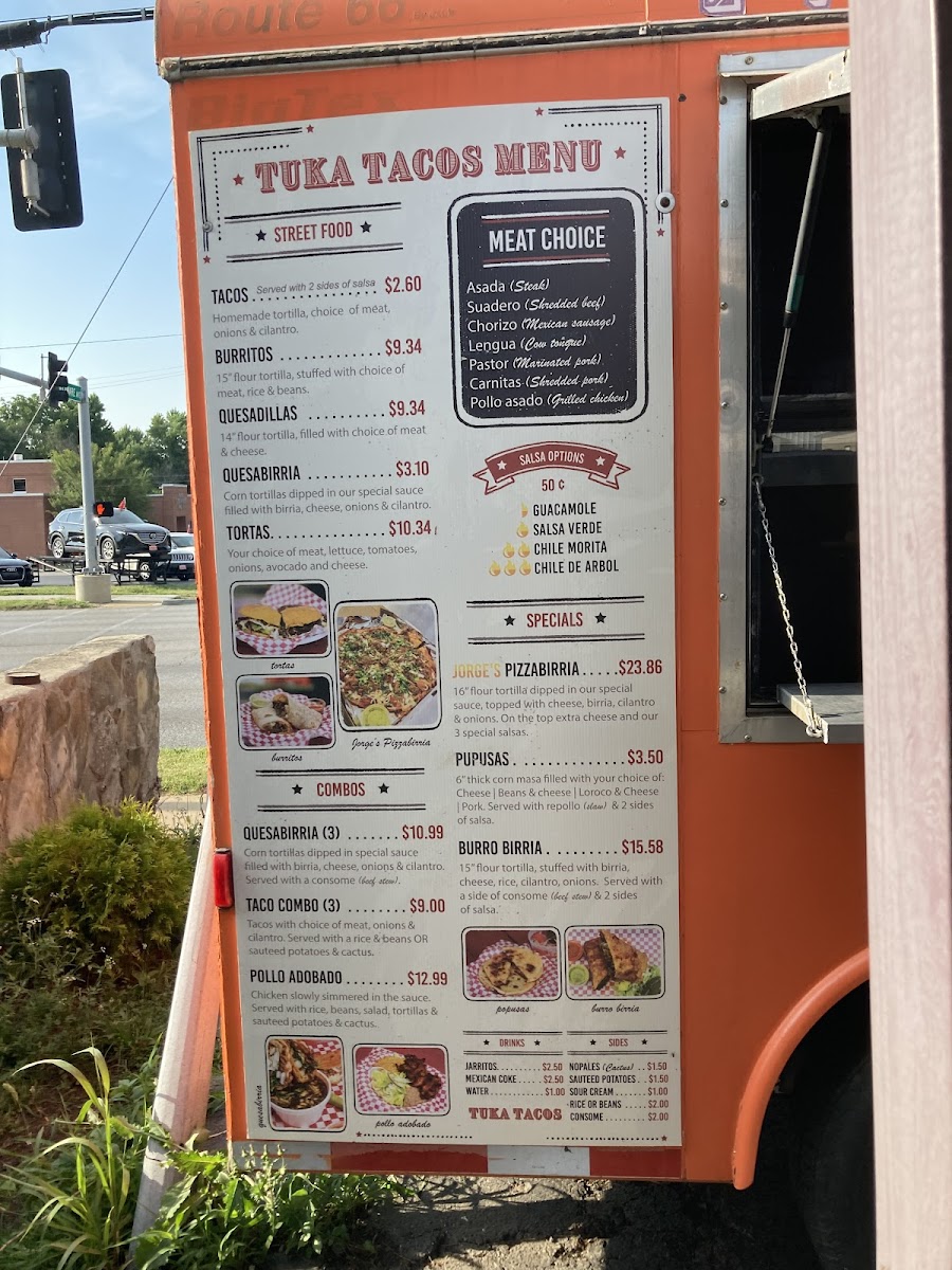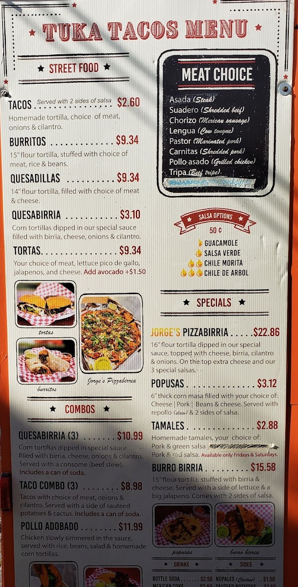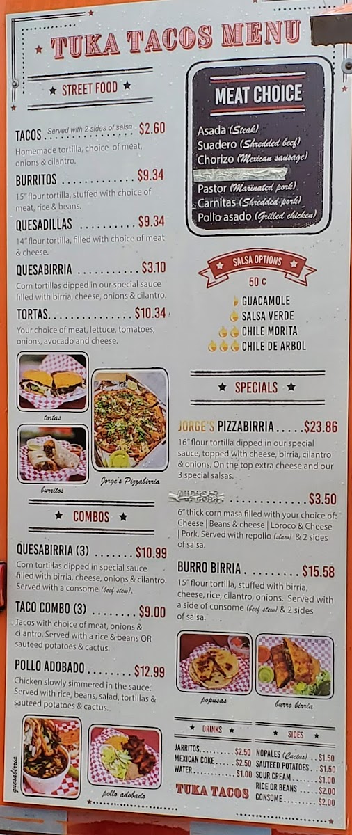 Tuka Tacos offers a diverse and flavorful menu that captures the essence of Mexican street food with a few inventive twists. The menu features a variety of options to satisfy different tastes, from their Crunchwrap Supreme and Chori Burger to the ever-popular Taco Tuesday Special. For those looking for a hearty dish, the Pozole on Saturdays is a must-try, while the Birria Grilled Cheese and Birria Crunchwrap offer a deliciously unique spin on traditional comfort food. Other tempting specials include Jorge's Pizza Birria and the Tukita's Platter Box, which provide a satisfying mix of flavors. The restaurant also has plenty of combo options, such as the Pollo Adobado and the Quesabirria Combo (3), which are perfect for those looking for a filling meal. Sides like Rice or Beans, Sautéed Potatoes, and flour tortillas complement the main dishes. For a refreshing drink, try a Mexican Coke, Jarritos, or simply water. To enhance your meal, you can also opt for additional salsas or Sour Cream. The menu at Tuka Tacos combines traditional Mexican flavors with creative innovations, making it a great spot to enjoy authentic and satisfying meals at reasonable prices.